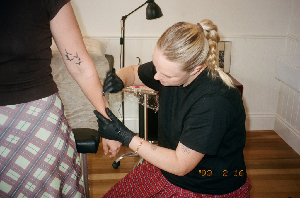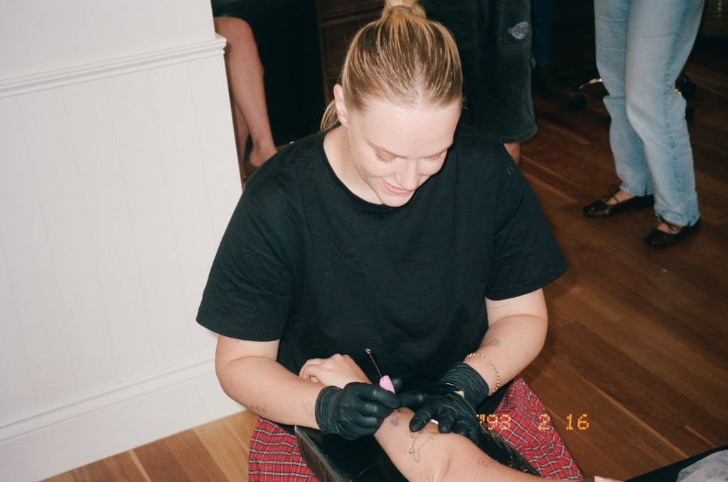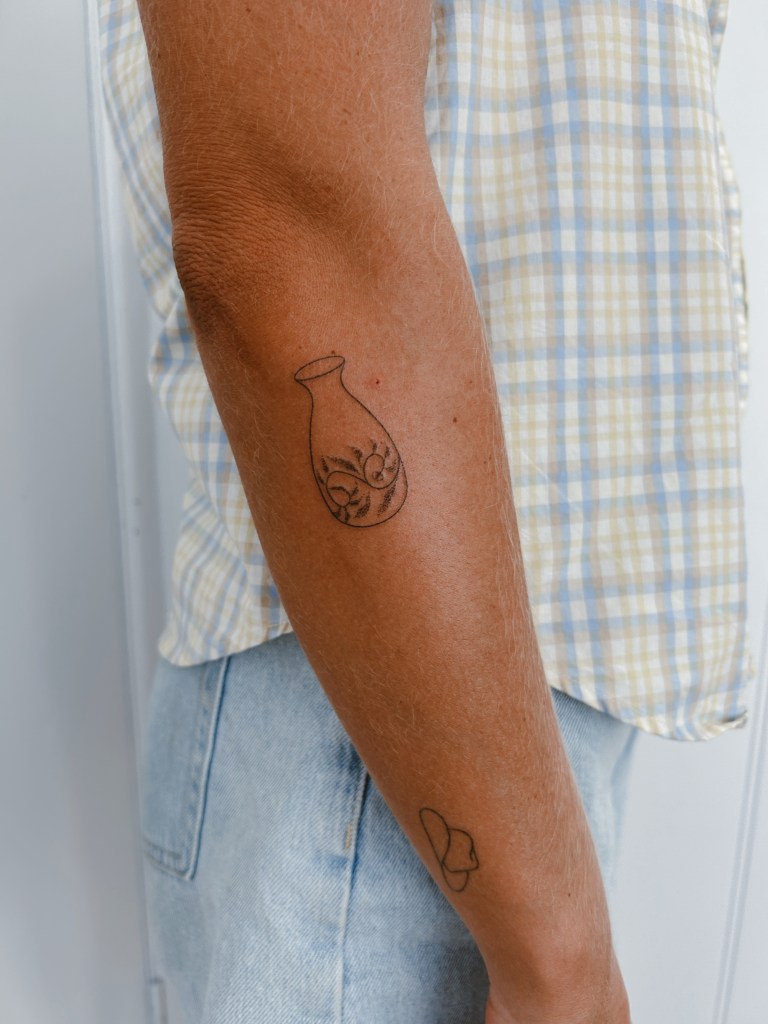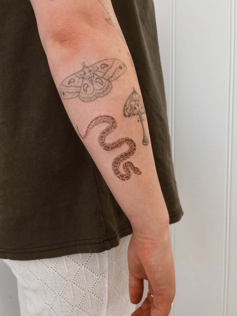 Pokey Pokes is a hand-poke tattoo artist whose work blends playful symbolism with a raw, intuitive edge. Using traditional stick-and-poke techniques, each piece is created slowly and intentionally – resulting in soft, textured lines that give her tattoos a natural, almost organic feel. Her style draws on a mix of folk-inspired imagery, celestial motifs, and simple, striking forms. From spirals and suns to delicate botanicals and abstract figures, her work carries a quiet sense of meaning while still feeling light, expressive, and approachable.There’s an effortless honesty to her tattoos; slightly imperfect in a way that feels human and grounding. Each design sits gently on the skin, with a focus on flow, placement, and subtle detail.